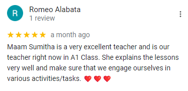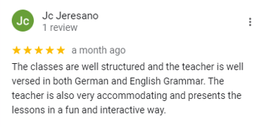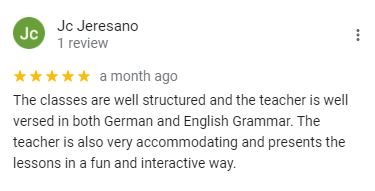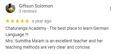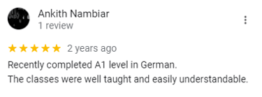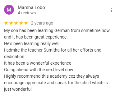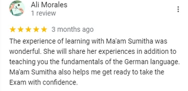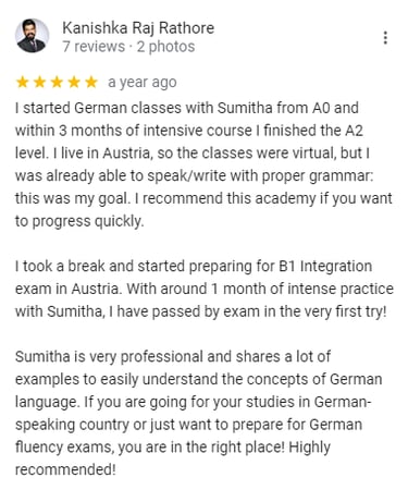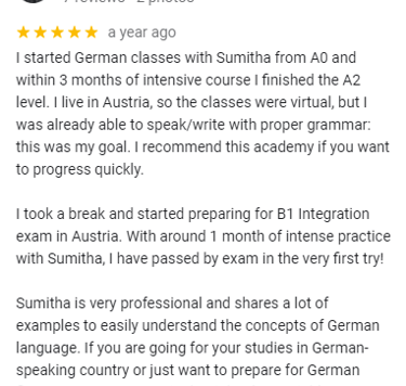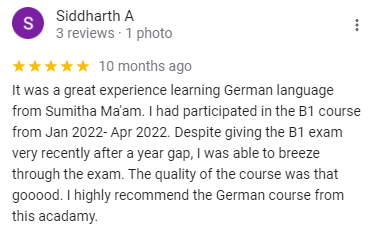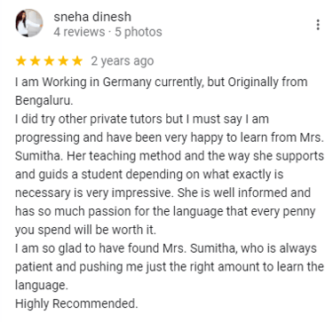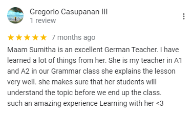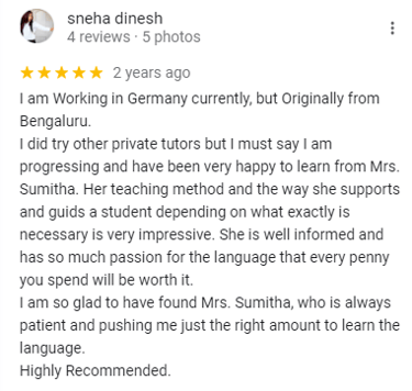 Currently, I am certified as C1-level from Goethe Institute, Bangalore. I have been coaching students of A1 to B2 levels as per CEFR standards and prepare them for A1 to B2 exams at Goethe Institute. I provide both online(MS Teams platform) and classroom coaching. Furthermore, I also conduct dedicated grammar, spoken and Goethe-exam preparation sessions. I assure you to provide strong foundations of grammar, vocabulary and pronunciation. Contact me to benefit and experience the unique and easy way to learn German!